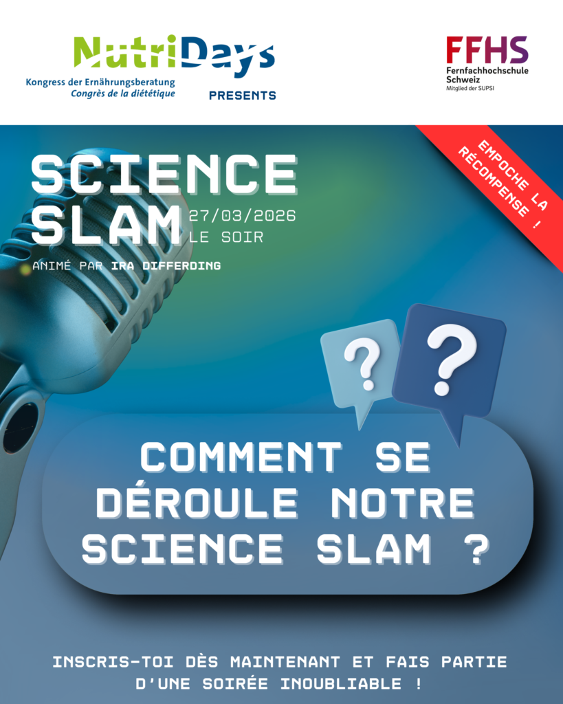 Tu as réalisé un travail scientifique passionnant ou rédigé un rapport de cas et tu souhaites le présenter de manière divertissante ? Alors le Science Slam est fait pour toi. Tu présenteras ton sujet de manière à ce que le public apprenne tout en s’amusant. C’est toi qui décides comment tu t’y prends. Les possibilités sont nombreuses, l’important est avant tout ta personnalité.